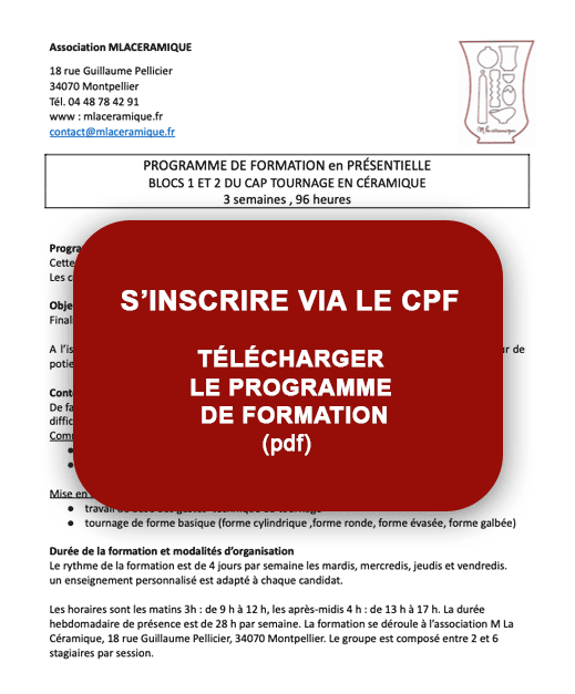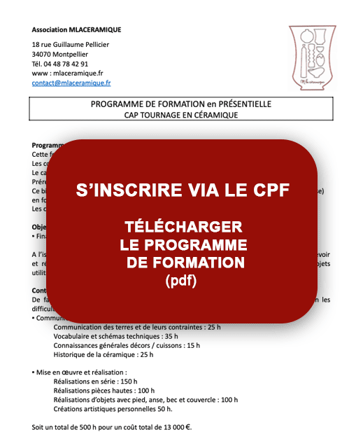 La formation professionnelle proposée par M La Céramique s’adresse aux adultes souhaitant se former aux métiers de la céramique, que ce soit dans une démarche de reconversion professionnelle, de spécialisation ou de perfectionnement. Située à Montpellier, cette formation complète permet d’acquérir les compétences essentielles du tournage céramique et de la fabrication artisanale. Un des atouts majeurs de cette formation est son éligibilité au CPF (Compte Personnel de Formation). Ce dispositif permet de financer tout ou partie du parcours de formation, facilitant ainsi l’accès à un apprentissage qualifiant sans contrainte financière importante. Le CPF est aujourd’hui un levier clé pour les adultes souhaitant changer de métier ou développer de nouvelles compétences dans le domaine de l’artisanat.